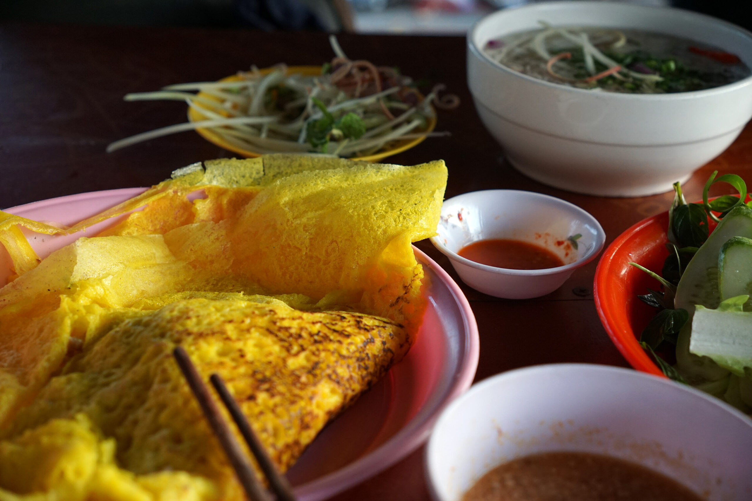Kurkumiga värvitud riisijahust täidisega pannkoogid ehk Vietnami köögist tuntud banh xeo analoog.