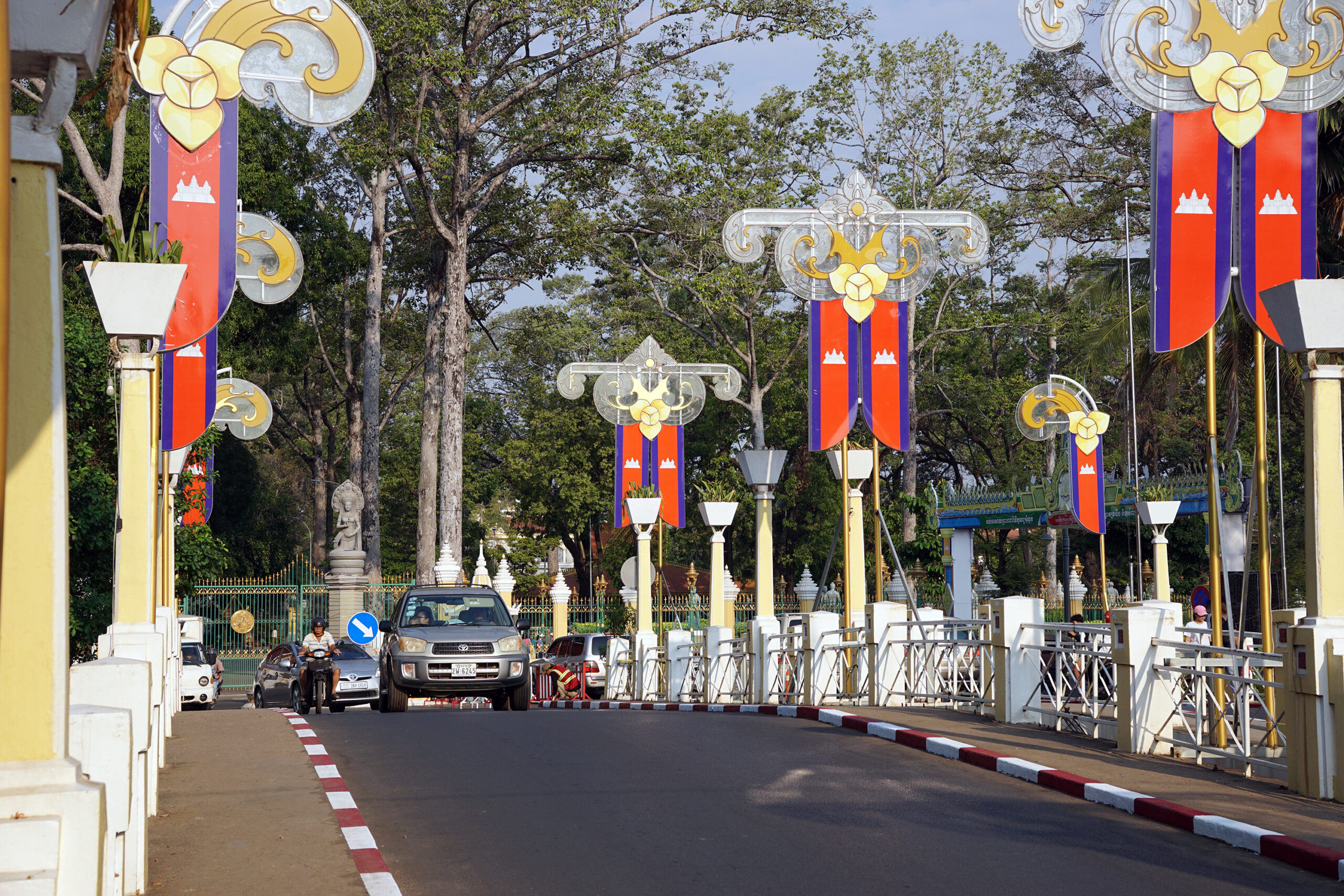 KambodĹľa lippudega sild Siem Reapis. Muuhulgas võib lipul näha Angkor Wat’i kujutist.