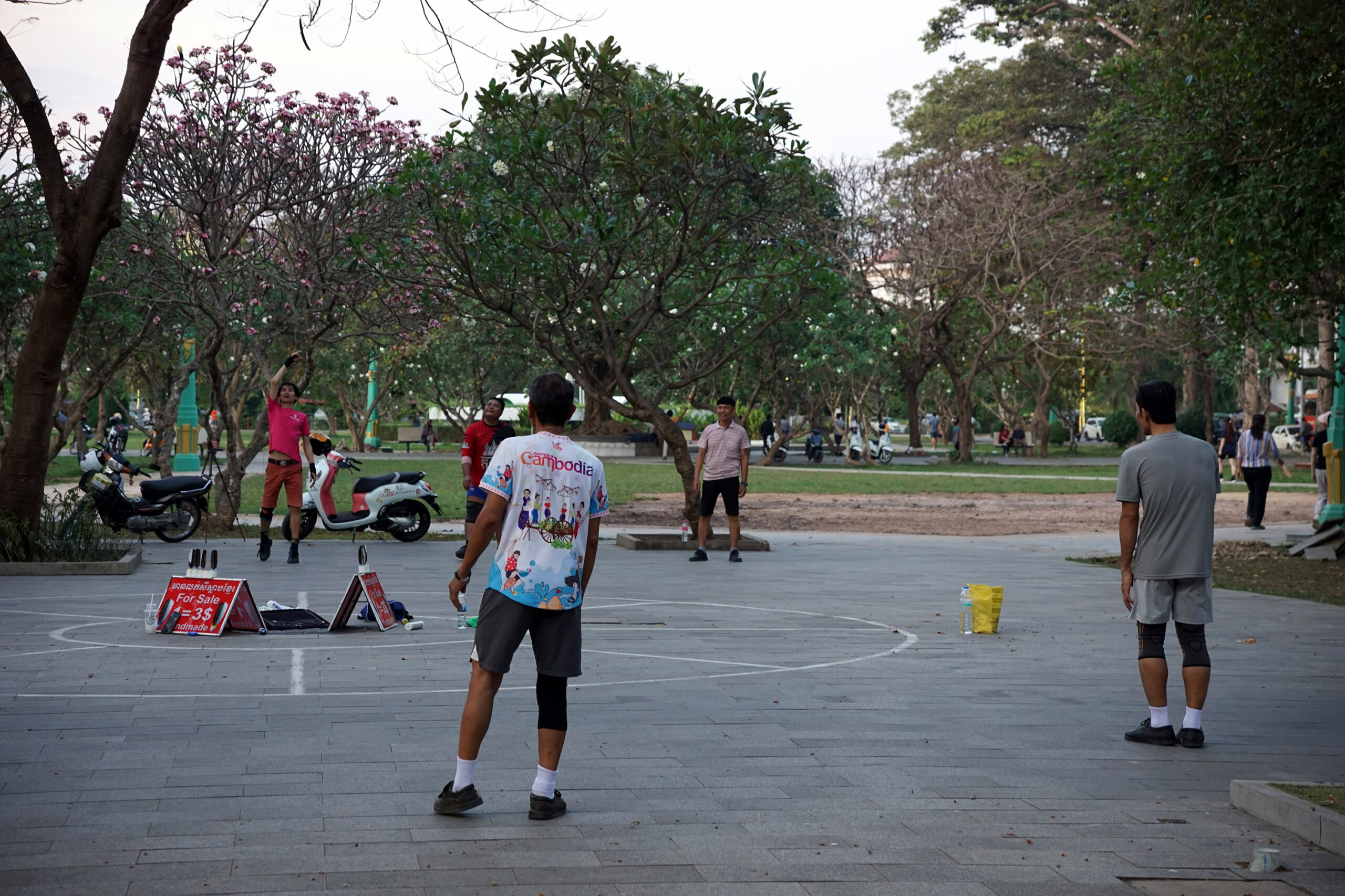 KambodĹľias, nagu Kagu-Aasias tervikuna, oskavad inimesed nautida vaba aega. Pildil mängivad kohalikud mehed hiinapärast mängu nimega ‘jianzi’, kus peaasjalikult jalgade abil lĂĽĂĽakse teineteisele raskusega sulgpalli.