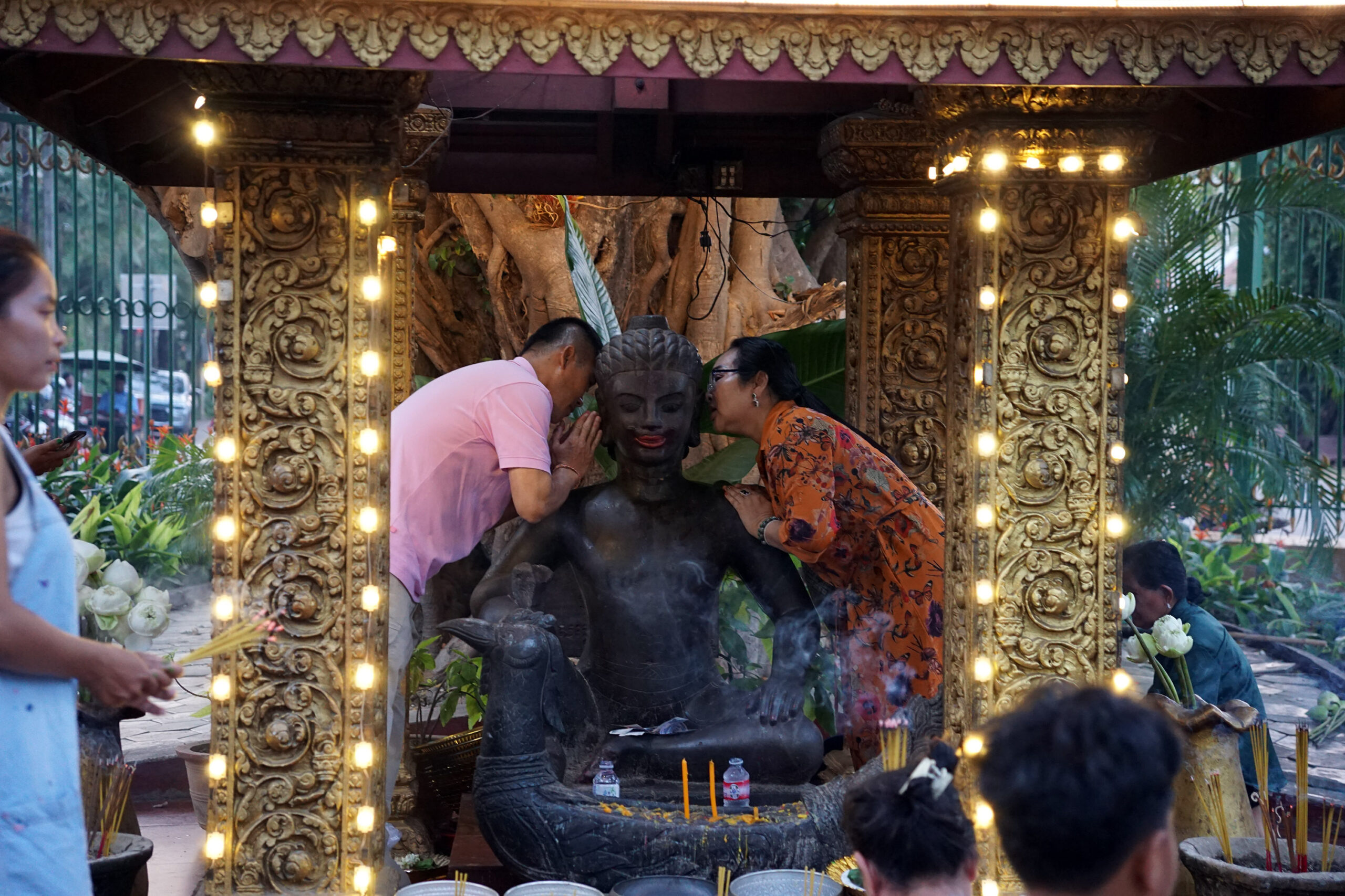 Khmeerid on enamasti budistid, mistõttu aeg-ajalt võis näha ka budistlike templeid – mitmevärvilisi ja taevasse pürgiva katusega, just nagu Taimaal. Samas on riigi ida- ja kaguosas ka üsna esinduslik moslemite kogukond, kelleks on peamiselt tšamid ehk rahvus, kes aastasadu tagasi olid esmalt hindud, seejärel budistid ja tänasel päeval peaasjalikult islamiusulised. Üldiselt on nii khmeerid kui tšamid üsna hästi omavahel segunenud, mistõttu varahommikusel külaturul võis näha mõlemaid rahvaid ja uske käsi-käes juttu ajamas, hommikusööki nautimas ja eksisteerimas ühtse rahvana.